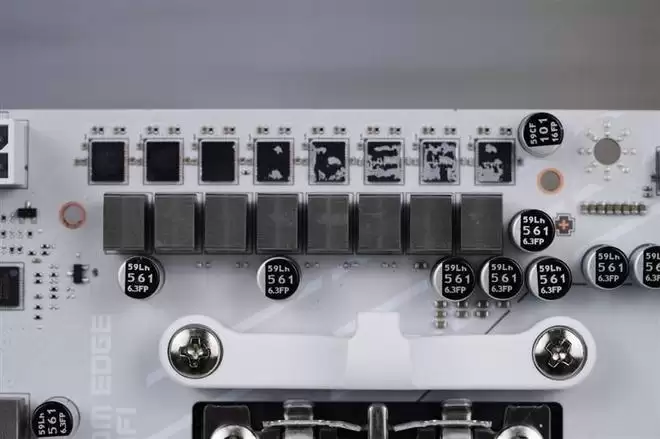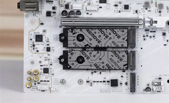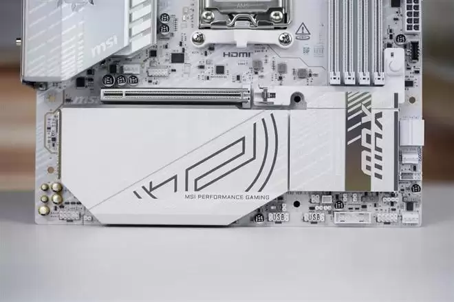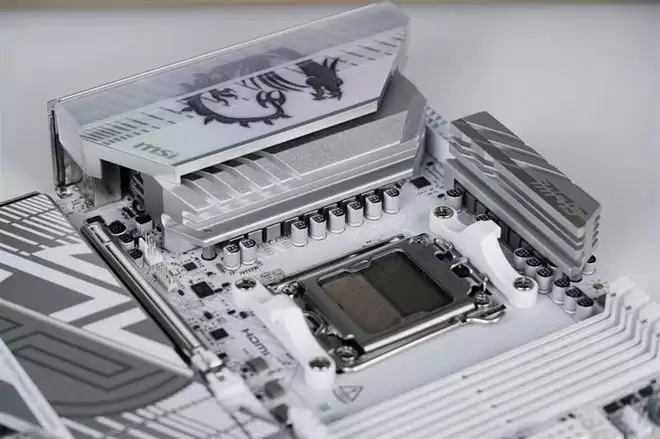 和其他号称白色、但实际上只有白色散热片的主板相比,MPG B850M EDGE TI MAX WIFI刀锋 钛将散热装甲、PCB板、内存插槽、PCIe接口、供电接口、SATA接口,甚至连固态电容等等,目光所及的元件都进行了白化处理。
