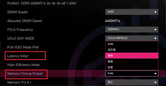 在BIOS中打开"延迟杀手",再将"Memory Timing Preset"设置为爆香。这里不太建议大家设置为逆天香,因为该选项会需求体质非常好的内存才能稳定。