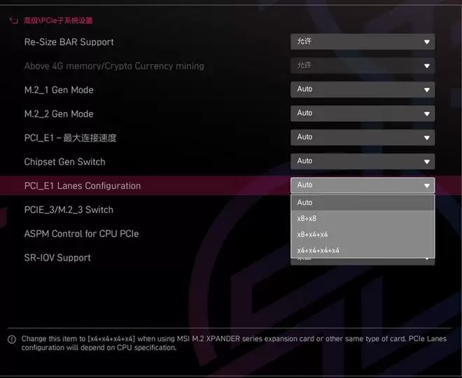 第一条PCIe插槽支持x8+x8、x8+x4+x4、x4+x4+x4+x4三种拆分方式。
