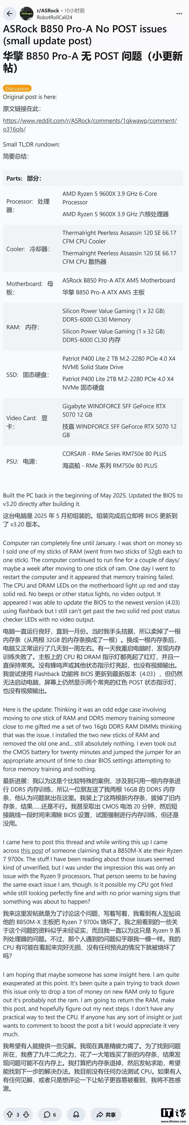 用户u/RobotRollCall24报告指出,其使用的华擎B850 Pro-A主板即便已升级至最新的4.03版本BIOS,依然导致了Ryzen 9600X彻底损坏,无法开机。