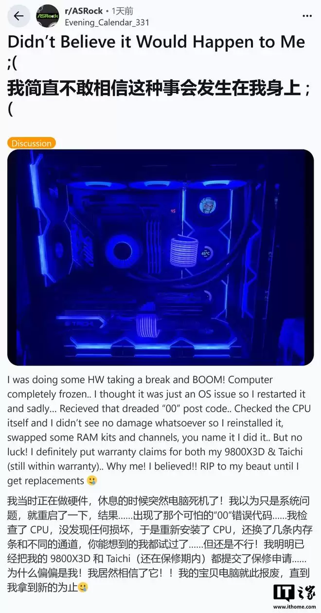 用户u/Evening_Calender_331的Ryzen 7 9800X3D处理器在华擎X870E Taichi主板上宣告报废,且故障发生时同样运行在最新的BIOS版本之下。