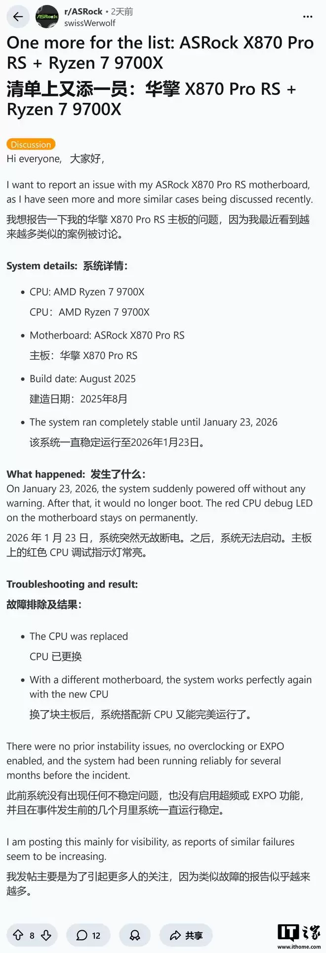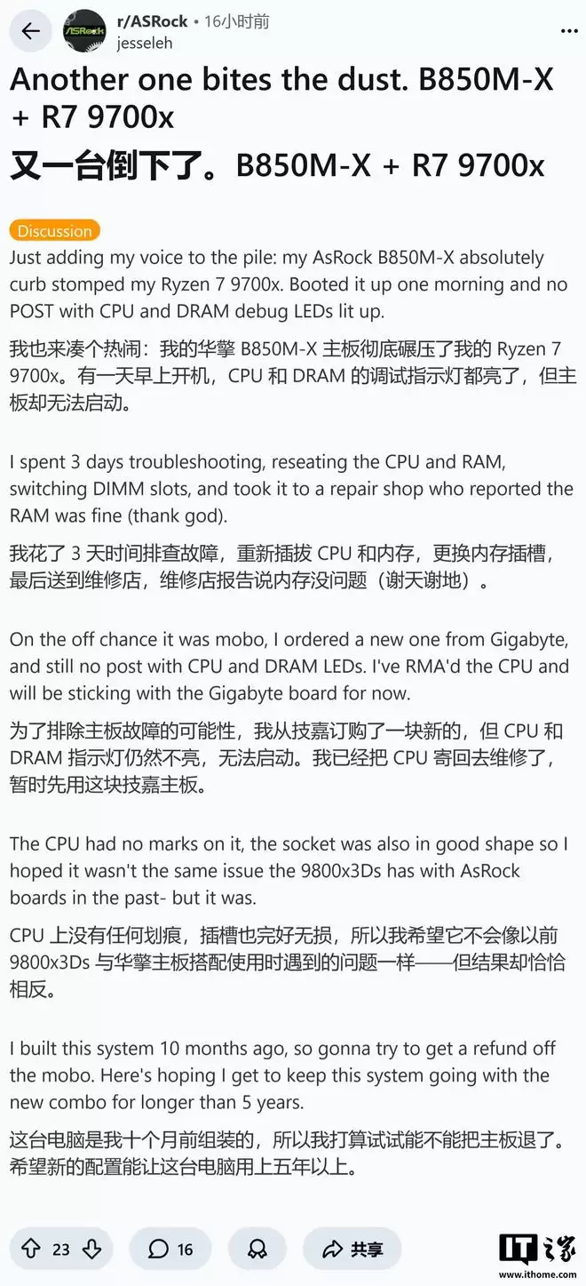 此外,另有两位用户分别在B850M-X和X870 PRO RS主板上遭遇了Ryzen 9700X损毁的问题。这些系统的故障表现高度一致:在正常运行一段时间后(例如从2025年8月使用至今),突然无法启动,且主板上的CPU或DRAM调试指示灯常亮,经排查确认处理器已物理损坏。IT之家附上相关图片如下: