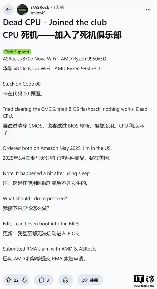 用户u/tminx49的顶级旗舰Ryzen 9 9950X3D也在华擎X870E Nova WiFi主板上“暴毙”。该用户的系统自2025年5月运行至今,如今主板直接显示代表“CPU故障”的“00”错误代码,目前该用户已被迫申请售后。