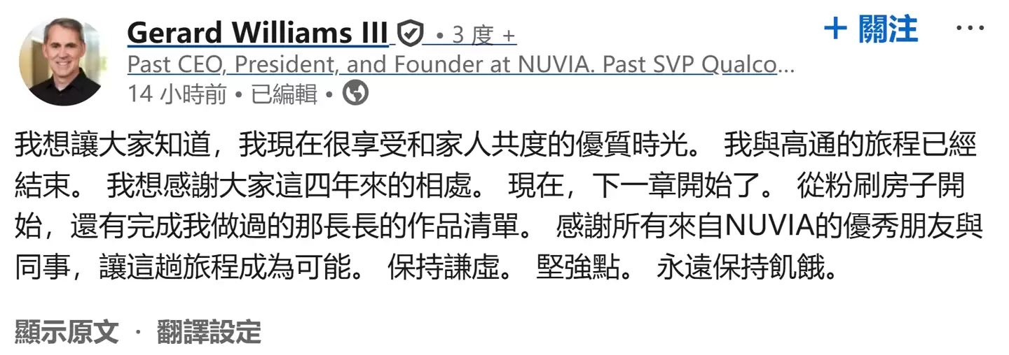 据IT之家2月3日消息,芯片设计师杰拉德·威廉姆斯三世(Gerard Williams III)今天在社交平台宣布,自己已经离开了高通公司。