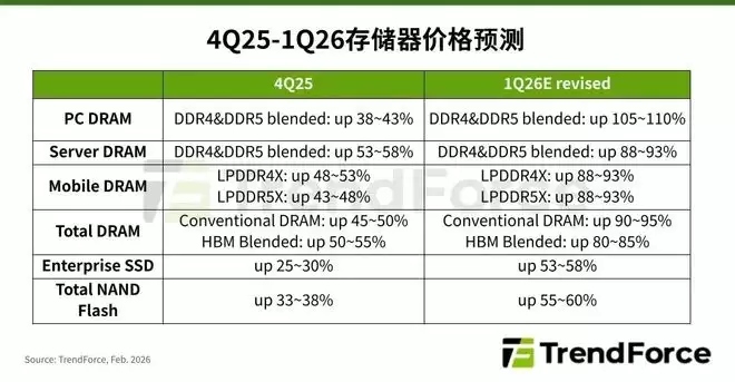 近期,TrendForce集邦咨询发布研究报告,全面上修第一季度DRAM与NAND Flash各类产品价格季度涨幅。最新预估显示,整体传统DRAM合约价将从一月公布的季增55%-60%,上调至90%-95%;NAND Flash合约价则从先前预测的33%-38%上修至55%-60%,并且不排除价格仍有进一步上涨的可能。