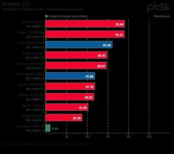 视频编码:在x265和Kvazaar测试中,3B6000表现一般。由于缺乏针对LoongArch指令集的底层汇编优化,目前仍落后于生态成熟的x86架构。