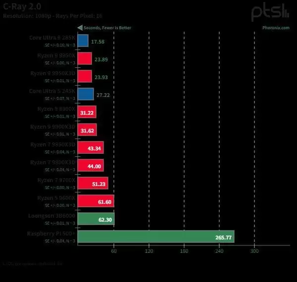龙芯3B6000最令人瞩目的胜利之一是在C-Ray光线追踪测试中取得的。龙芯3B6000的性能与Ryzen 5 9600X不相上下……没错,Ryzen 5 9600X是6核12线程的AMD Zen 5处理器,而龙芯3B6000是12核24线程的处理器,但这仍然是本轮基准测试中最具竞争力的结果之一。