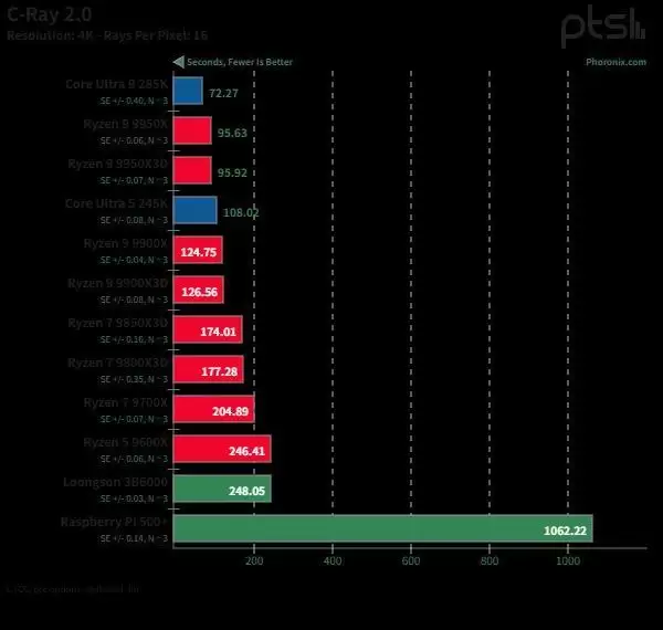 亮点表现(C-Ray):在光线追踪基准测试C-Ray中,12核心的3B6000表现惊人,几乎能追平6核心的AMD Ryzen5 9600X。