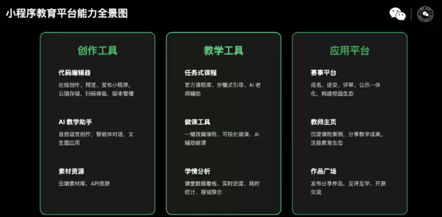 微信表示,旗下小程序教育平台已连续五年持续迭代,免费为师生提供覆盖“学AI、用AI、教AI”全流程的教学支持。在创作工具方面,平台提供代码编辑器,支持在线创作、预览和发布小程序,还能实现云端存储与版本管理;教学工具则涵盖任务式课程、最新课程库及AI助教功能,紧密贴合信息科技课标;应用平台包含赛事平台,实现报名、提交、评审、公示一体化流程。