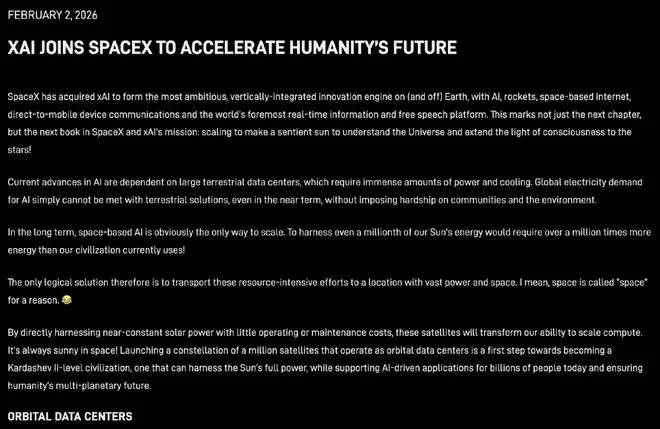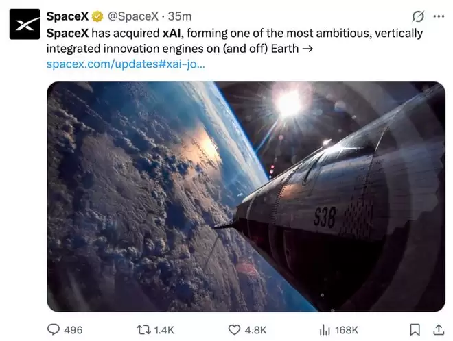 “这笔交易将打造地球上(乃至地球之外)最具雄心、垂直整合程度最高的创新引擎,涵盖人工智能、火箭技术、太空互联网、直连移动设备通信技术,以及全球最重要的实时信息平台 X 。