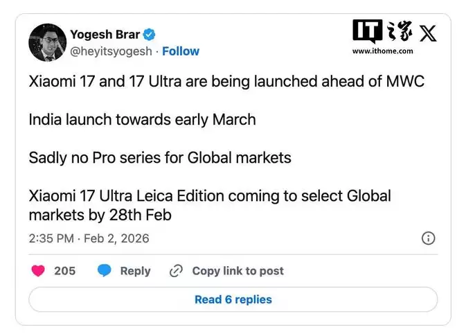 据IT之家2月3日消息,知名爆料人Yogesh Brar透露,小米17标准版预计将于3月初之前在印度市场推出,而小米17 Ultra徕卡版则定于2月28日面向全球市场发布。