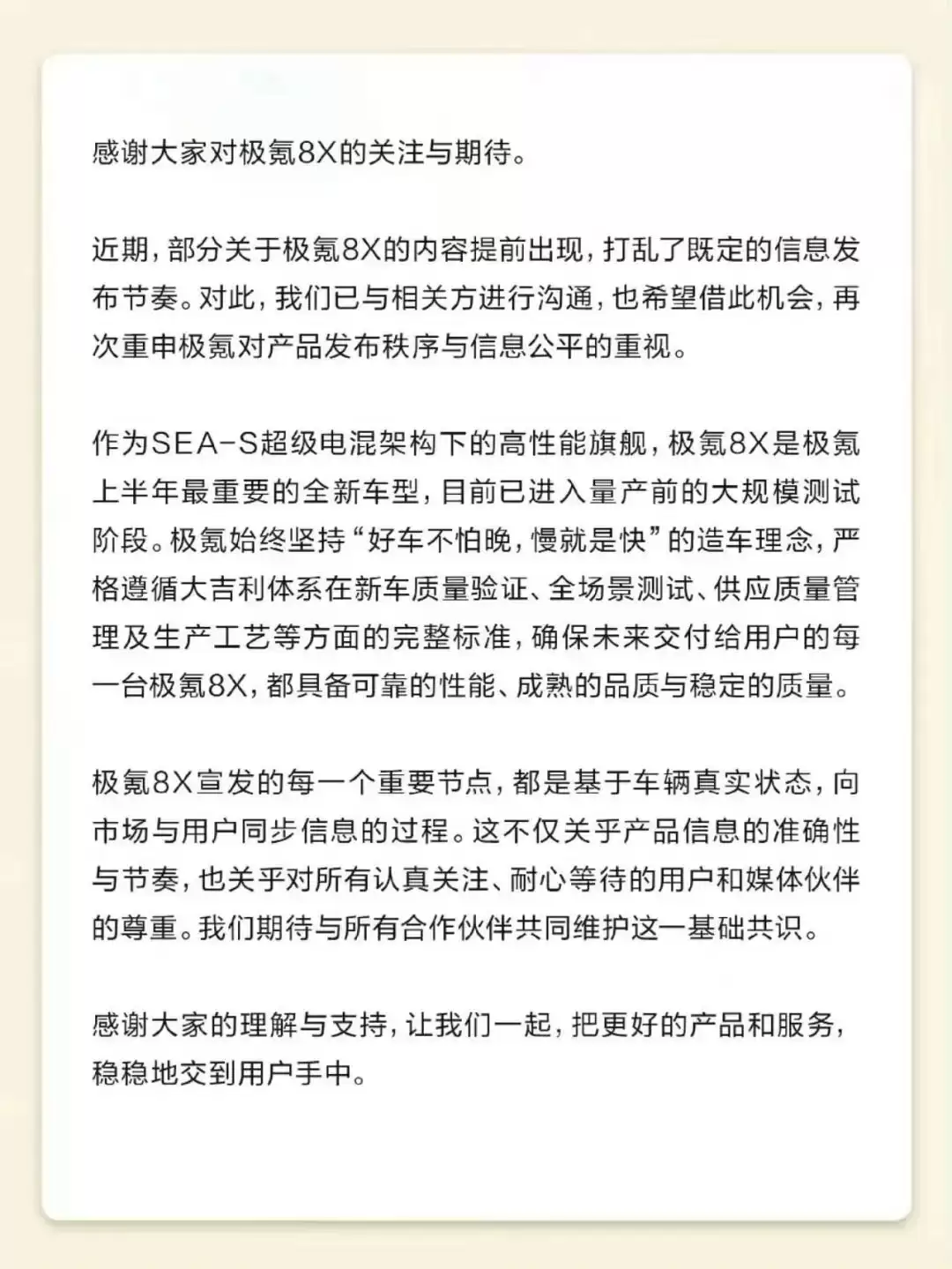 “极氪8X每项重要进展的公布,都是基于车辆真实研发状态,向市场和用户同步信息的过程。这不仅关乎产品信息的准确性与节奏,也关乎对所有认真关注、耐心等待的用户及媒体伙伴的尊重。我们期待与所有合作伙伴共同维护这一基础共识。”极氪方面如此表示。