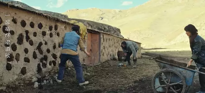 镜头一转,忙活了一天的白菊就这么坐在地上,吃着老藏民用手揉搓了很久的糌粑,一阵风沙吹过,画面显得更加沧桑。