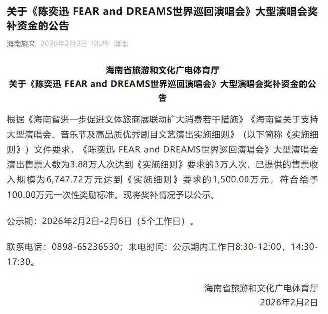 近日,海南省旅游和文化广电体育厅一则奖励公示引发了不小的讨论:陈奕迅在海口举办的演唱会获得了一次性100万元的奖励,而张学友在同地的演唱会也拿到了50万元的奖励。网友们对此看法不一,褒贬各异,争论持续不断。