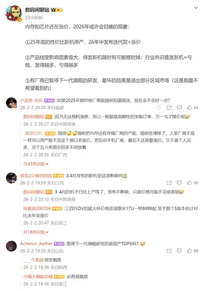 详细来说,博主透露受内存和芯片持续涨价影响,已有手机厂商暂停下一代旗舰研发,最坏的结果是退出部分区域市场。