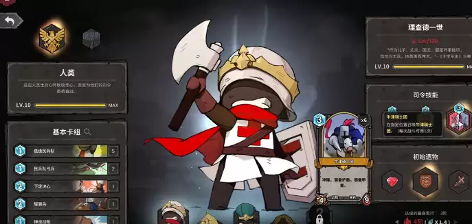 第2回合,骑兵卡牌到手之后,就让骑兵冲在前面,弓箭手跟在后面输出。第3回合,直接扔出牛津骑士团,一波爆发就能带走对手,还可以顺势解锁巨鹰以及兵术两张新卡。兵树可以强化所有手牌,但目前会缺少范围性伤害,因此果断选择巨鹰。范围性攻击在清理敌方杂兵时确实很有优势。然后继续推进,就会进入实验室。一个问号事件开出了哥布林存款,第1波轻骑兵可以去冲阵,后面跟一个小步兵补位,直接就可以清空对手的前排。