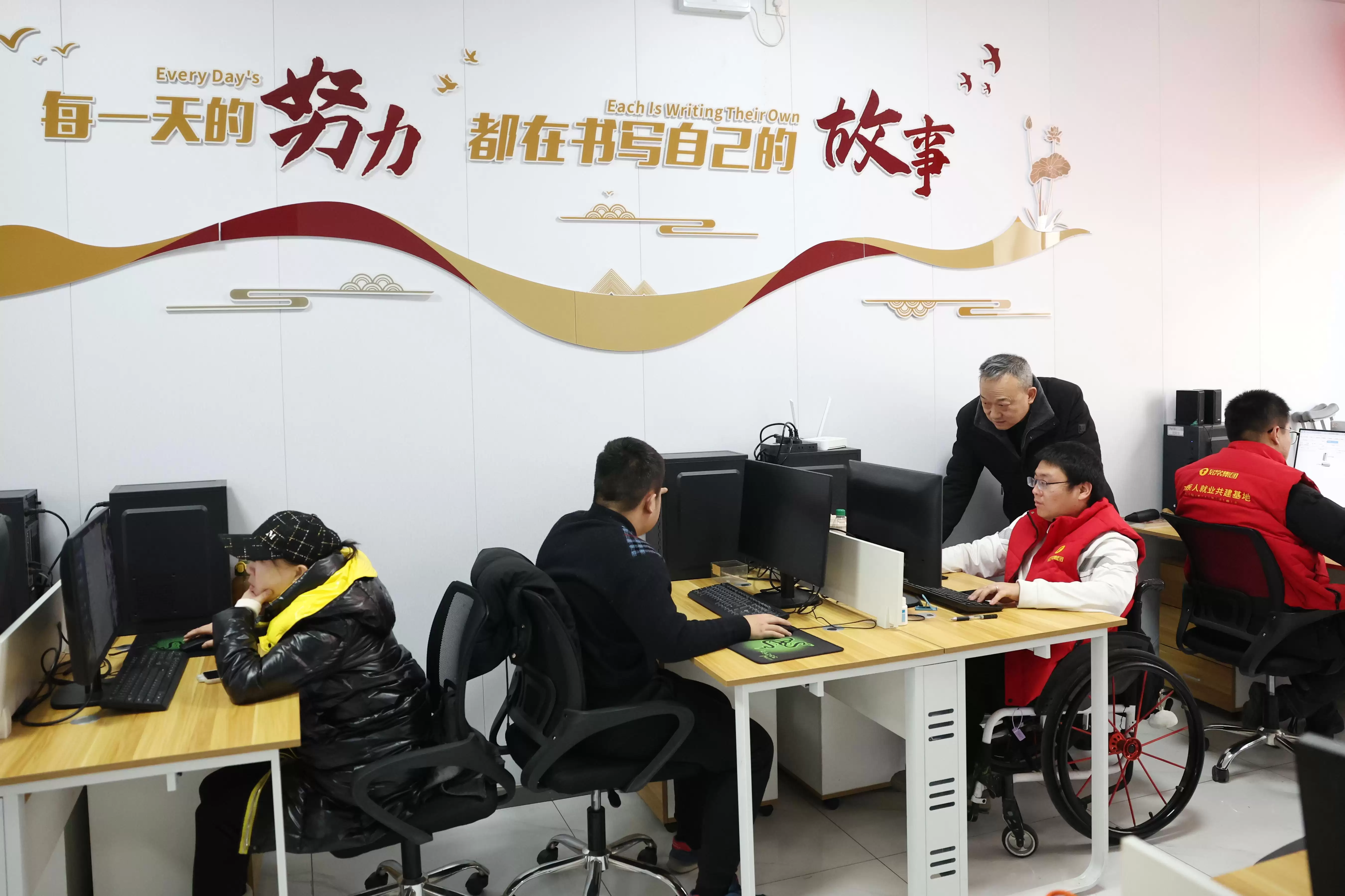在兰州市心连心社会工作服务中心的残疾人“AI就业工坊”里,残疾人AI训练师们正进行数据标注。(新华社记者陈斌 摄)