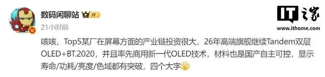 是这么回事,微博博主昨日透露,称 Top5某厂商今年的高端旗舰将继续使用双层 OLED+BT.2020,率先商用新一代 OLED 技术,材料也是国产自主可控,并且在显示寿命、功耗、亮度、色域等方面都有突破。