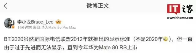 第二次是透露 BT.2020虽然是国际电信联盟2012年就推出的显示标准(不是2020年),但一直由于过于先进而无法显示,直到今年 Mate 80 RS 上市。