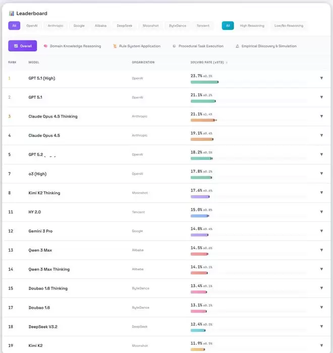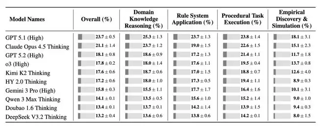 在不提供任何 Context 的情况下,最先进的模型 GPT-5.1 (High) 仅能解决不到 1% 的任务。这证明了数据是无污染的,模型若不从 Context 中学习,几乎完全无法解决这些任务。