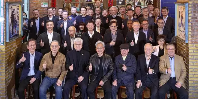 照片的背景是中国台湾省台北市的砖窑古早味怀旧餐厅,画面中,英伟达CEO黄仁勋与台积电董事长魏哲家、鸿海董事长刘扬伟等多位AI供应链高管面对镜头,集体竖起了大拇指。
