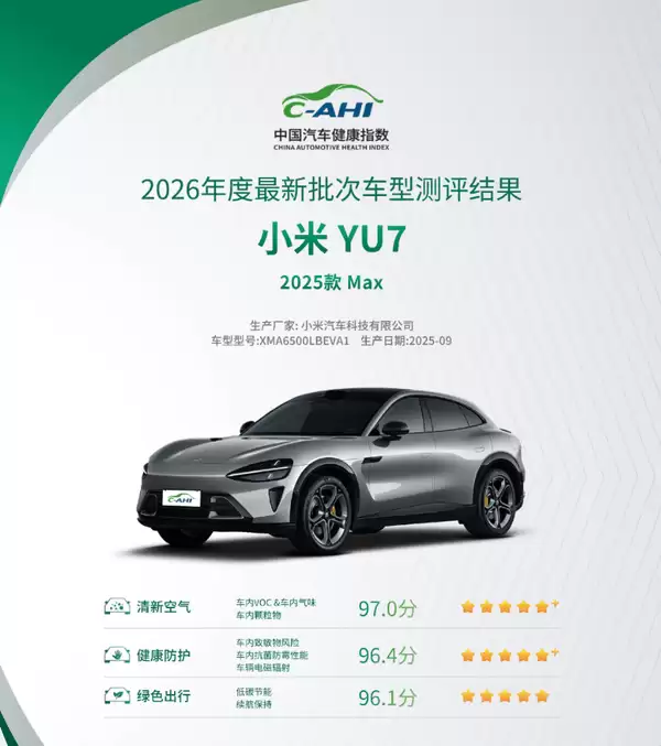 小米YU7 Max获中国汽车健康指数最优评级,环保设计守护出行健康