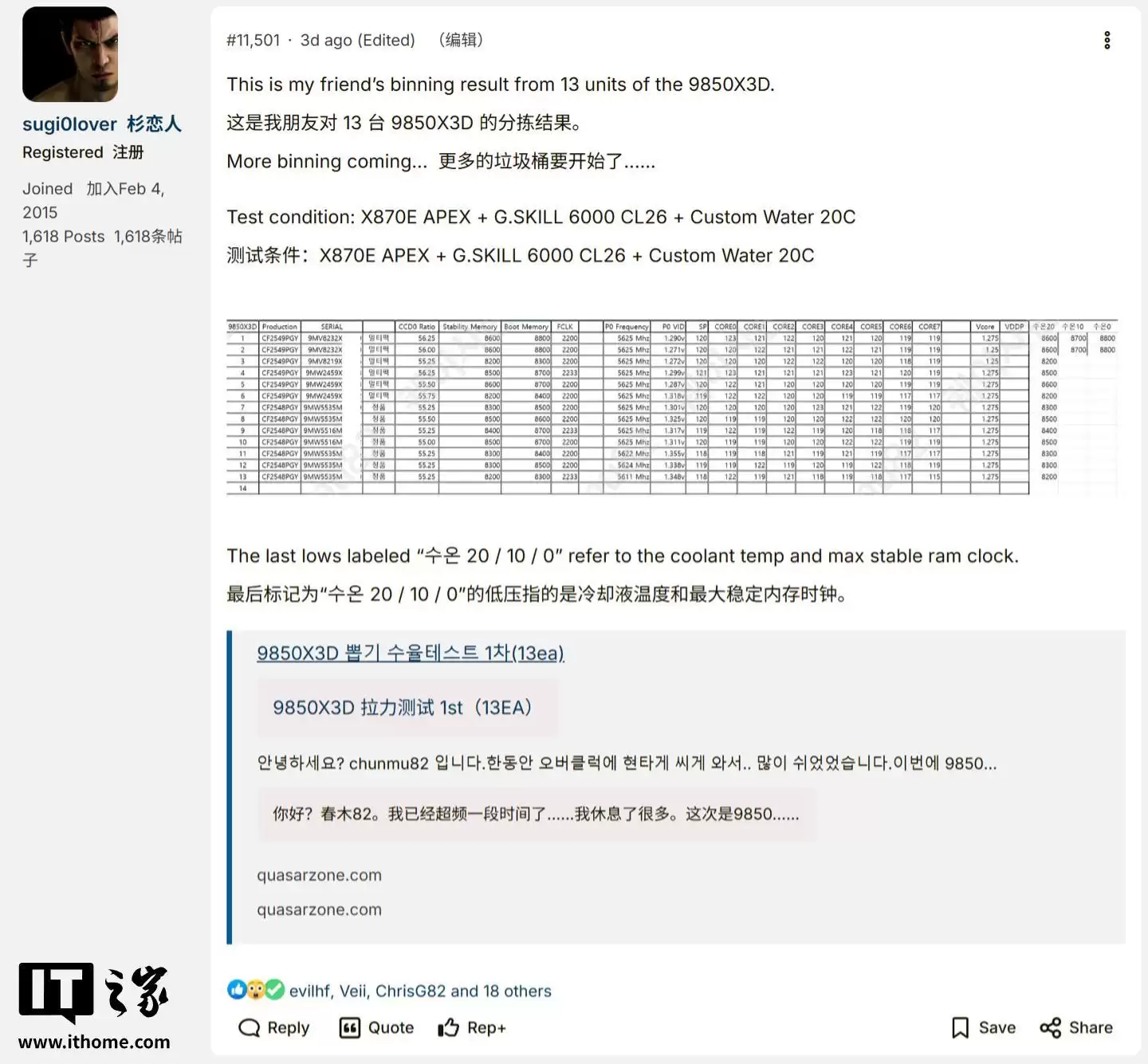 IT之家2月3日消息,网友sugi0lover于2月1日在Overclock论坛发帖称,基于13颗AMD Ryzen 7 9850X3D处理器的体质测试(Binning)数据显示,该处理器本质上是出厂预超频的9800X3D。