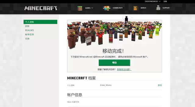 ④ 迁移完成。最后请注意一点,迁移完成后,你需要在《我的世界》最新版启动器上使用微软账户进行登录。