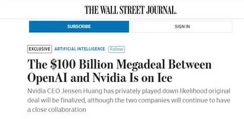 在这次合作官宣之后的几个月里,外界没有看到后续的进展。而1月31日,《华尔街日报》发不了一篇名为“英伟达与 OpenAI 的千亿美元重磅交易已暂时搁置”,透露了很多英伟达方面的内部消息。