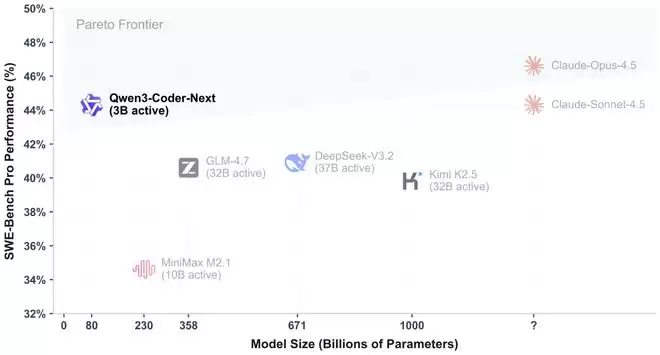 下图直观展示了Qwen3-Coder-Next如何在推理效率与任务性能之间取得更优的帕累托平衡。