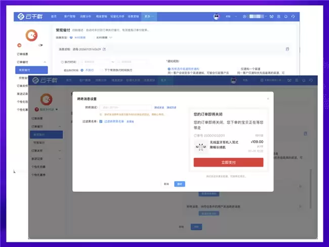 按订单状态(待付款 / 已发货 / 待收货 / 售后中)精准触发,关联用户标签(高客单价 / 复购用户等),实现千人千面推送;