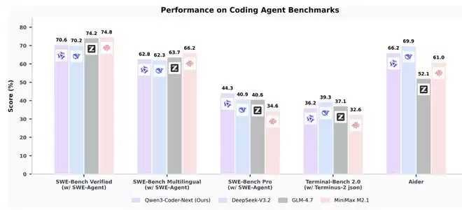 使用SWE-Agent框架时,Qwen3-Coder-Next在SWE-Bench Verified上达到70%以上,超过了DeepSeek-V3.2,接近GLM-4.7、MiniMax M2.1。