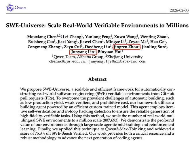 简单来说,他们提出了一个可扩展的高效框架SWE-Universe,用于从GitHub拉取请求自动构建真实世界的软件工程(SWE)可验证环境。利用一个构建Agent,团队将真实世界的多语言SWE环境的数量扩展到接近百万级(807693 个)。最后,团队将该技术应用于Qwen3-Max-Thinking,并在SWE-Bench Verified测试中取得了75.3%的高分。