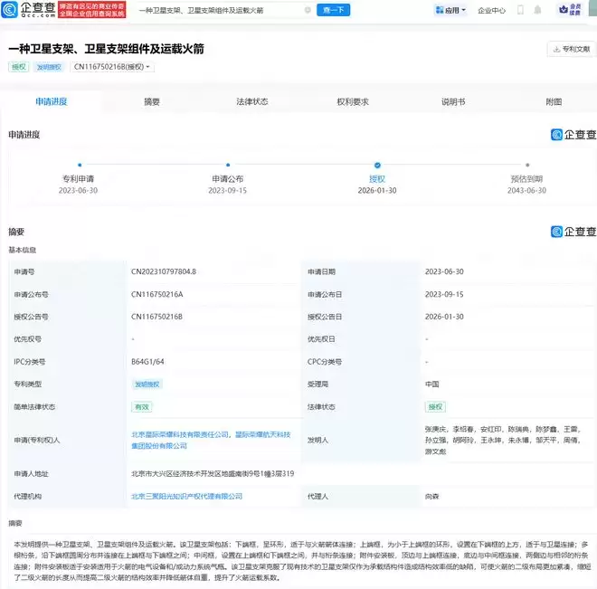 企查查APP信息显示,近日,星际荣耀航天科技集团有限公司的一项专利获得授权,该专利涉及“卫星支架、卫星支架组件及运载火箭”。