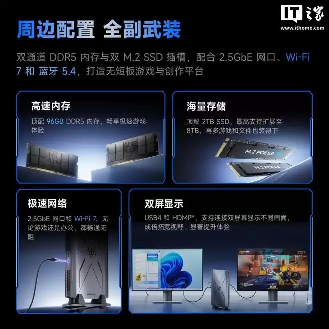 此外,这款迷你主机还提供了USB4、HDMI、2.5GbE网口等多种接口,并支持Wi-Fi 7与蓝牙5.4连接。准系统版本售价为8989元,32GB+1TB版本售价则为11889元。