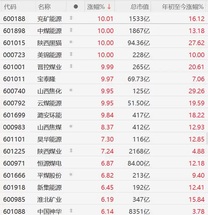 A股煤炭股强势领涨,能源股异动及兖矿等多股涨停