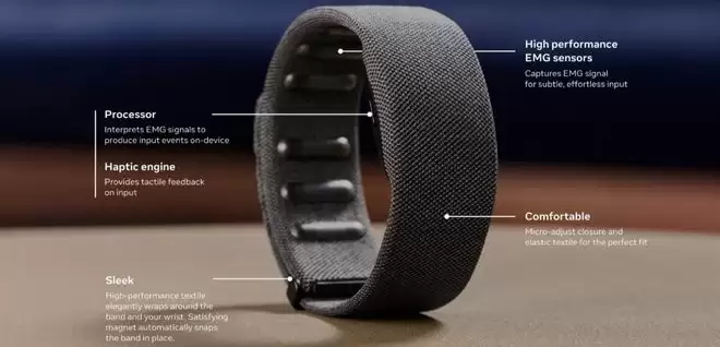 ▲Meta Neural Band是一款纤薄的腕带,内置高精度EMG传感器,可捕捉手部和手指的控制信号(图源:UploadVR)