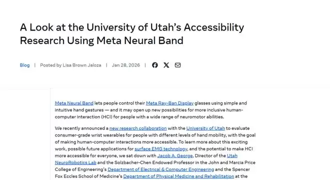 2026年1月28日,Meta最新宣布,与犹他大学启动一项新的研究合作,核心目标是评估面向不同手部活动能力人群的消费级腕部可穿戴设备,探索如何让更多用户便捷使用计算设备和数字界面。