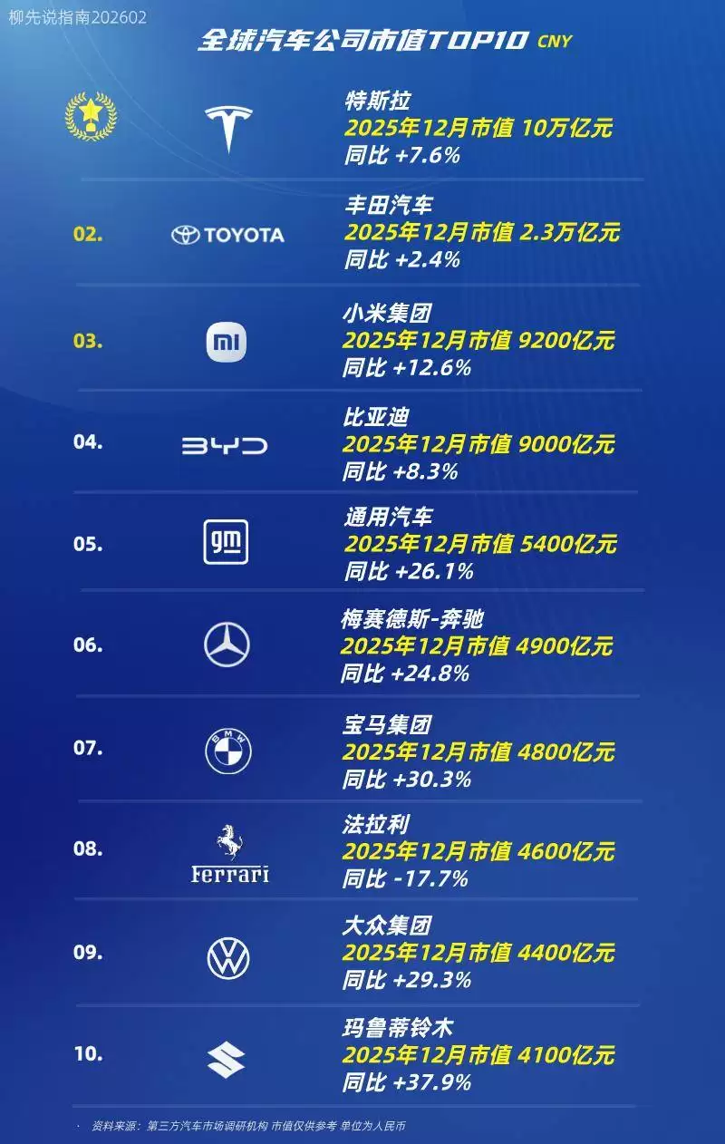 中国力量在榜单中的表现同样抢眼。比亚迪以九千亿元市值位居第四,其全年新能源汽车销量突破600万辆,在磷酸铁锂电池技术和混合动力平台领域建立起技术壁垒。小米集团作为跨界代表排名第三,虽然市值较峰值有所回落,但其通过“人车家”生态战略吸引年轻消费群体,智能座舱与手机系统的无缝连接成为差异化竞争优势。