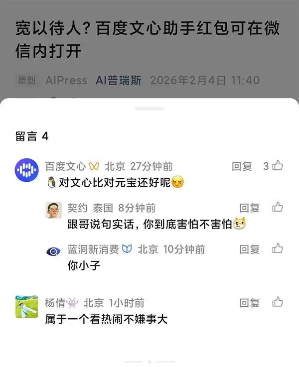 不过,自媒体发现百度文心助手红包,至少4日上午仍能在微信内打开。百度文心在文章下留言“撒娇”称:“对文心比对元宝还好呢”。
