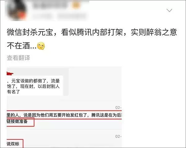 一名微博大V猜测称:“微信封杀元宝,看似腾讯内部打架,实则醉翁之意不在酒……”