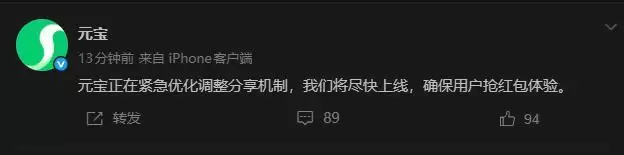 随后,元宝在微博平台发布通知称:“元宝正在紧急优化调整分享机制,我们将尽快上线,确保用户抢红包体验。”观察者网注意到,元宝的分享机制现已改成口令红包。