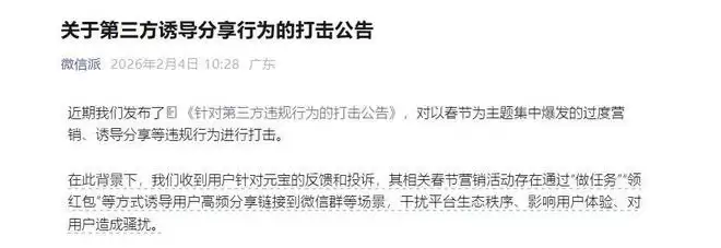 公告称,近期收到用户针对元宝的反馈和投诉,其相关春节营销活动诱导用户高频分享链接到微信群等场景,干扰平台生态秩序、影响用户体验、对用户造成骚扰。