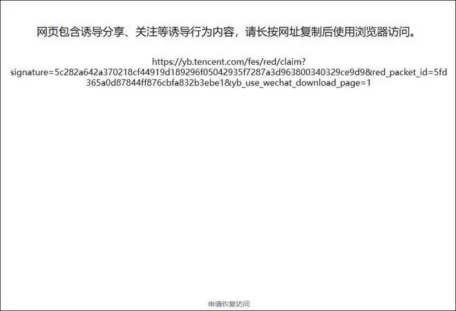 点开链接后,页面提醒称:“网页包含诱导分享、关注等诱导行为内容,请长按网址复制后使用浏览器访问。”页面同时附有“申请恢复访问”选项。