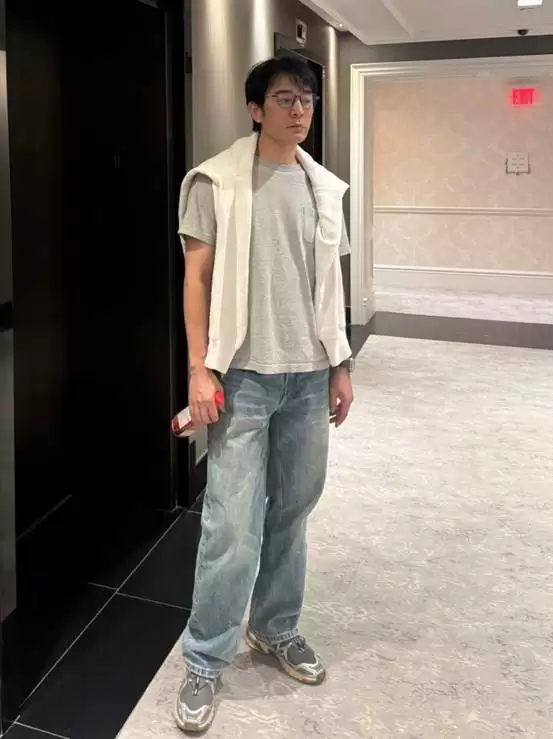 而剧外的李光洁虽然已经44岁,但穿搭却相当潮流,戴着黑框眼镜,灰色T恤搭配一条蓝色牛仔裤,显得格外年轻。