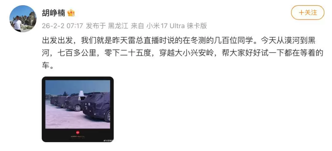 近日,顺为资本合伙人胡峥楠在社交平台发布了一组小米汽车冬测实车伪装照,首次以最新视角确认了小米大型SUV项目的存在。从曝光的画面可见,测试车队包含至少两款不同尺寸的车型,推测将形成覆盖五座与七座布局的产品矩阵。这一动态与去年10月雷军率队赴新疆开展路测的报道形成呼应,显示小米汽车第三款车型已进入研发冲刺阶段。