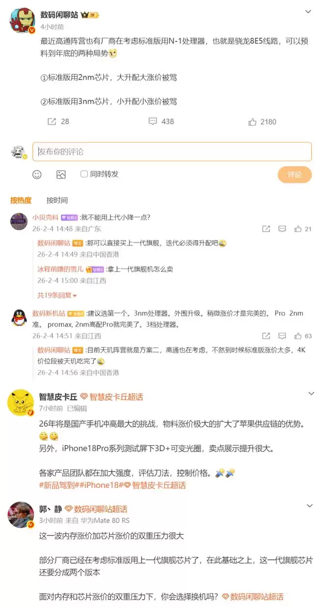 要么标准版上2nm芯片大升配却大幅涨价,要么用3nm芯片小升配小幅涨价,无论选哪种似乎都逃不过被用户吐槽的命运。