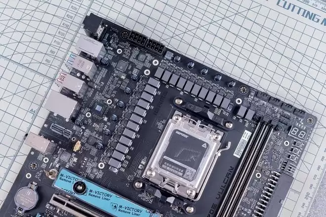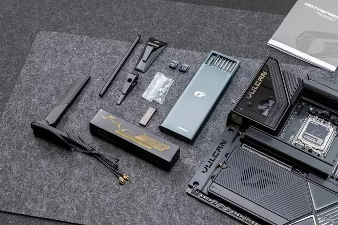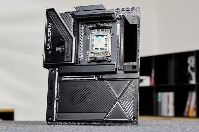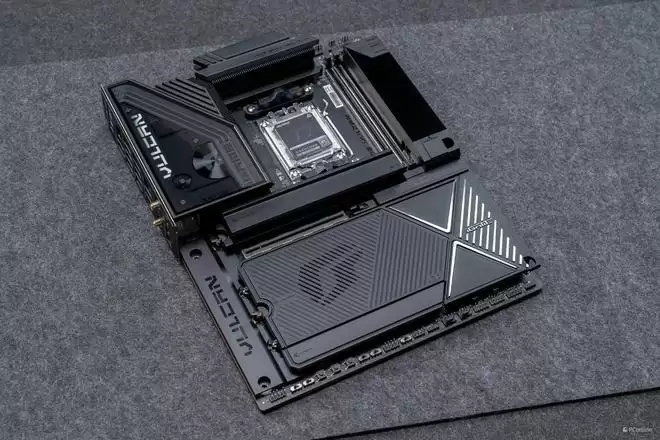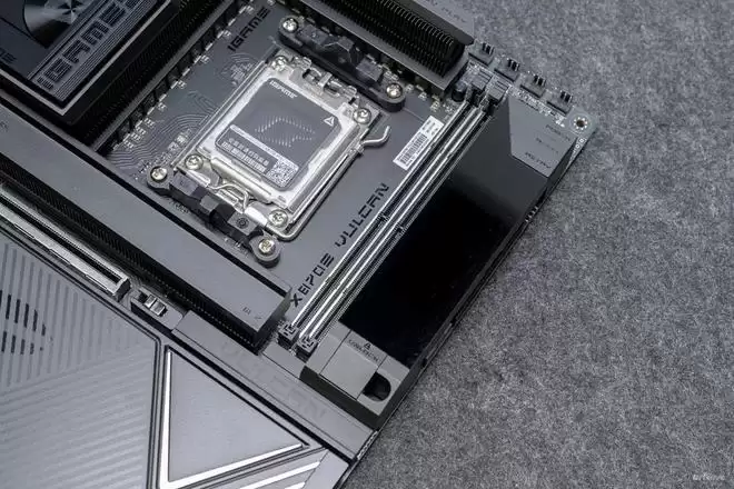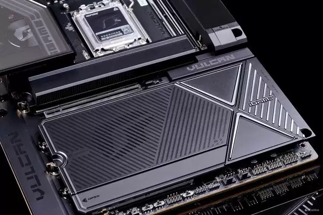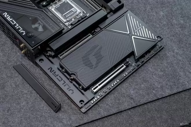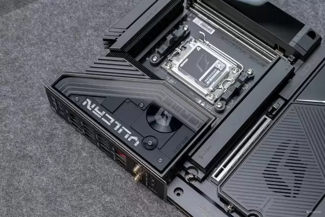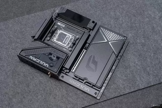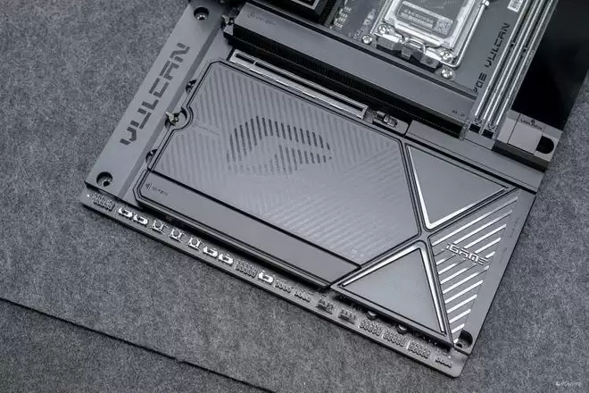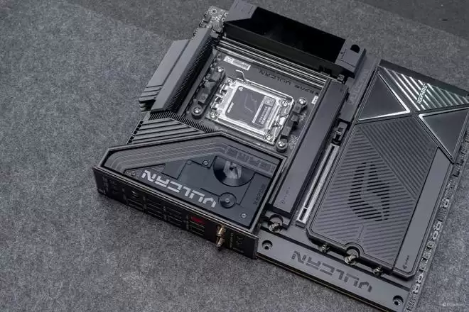 设计语言上,它完美复刻了VULCAN显卡的“赛博机械”风格。主板正面的散热装甲采用了复杂的CNC切割工艺,通过多道金属拉丝与磨砂处理,构建出一种冷峻的未来感。