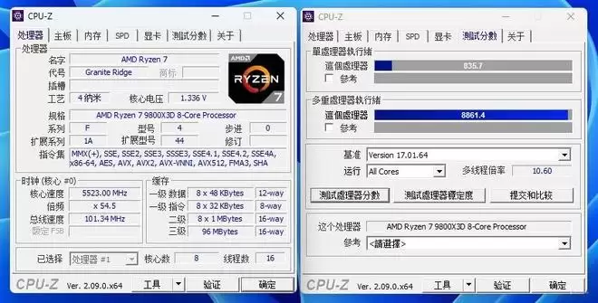 从实测数据的细节来看,这种提升绝非“纸面富贵”,是实打实的性能飞跃。在Cinebench R23 的多核测试中,默认状态下的20788分已经足够强悍,而但当开启Turbo 2+BLCK 101.38这一“高帧模式”后,分数直接飙升至23165分,提升幅度接近9%。同时单核性能也有了3%的提升。要知道,对于锐龙 7 9800X3D这种以3D V-Cache为核心、对电压和频率极为敏感的游戏处理器来说,通常被认为“出厂即灰烬”,能挖掘出如此巨大的性能潜力,有一说一,真的很不错了。