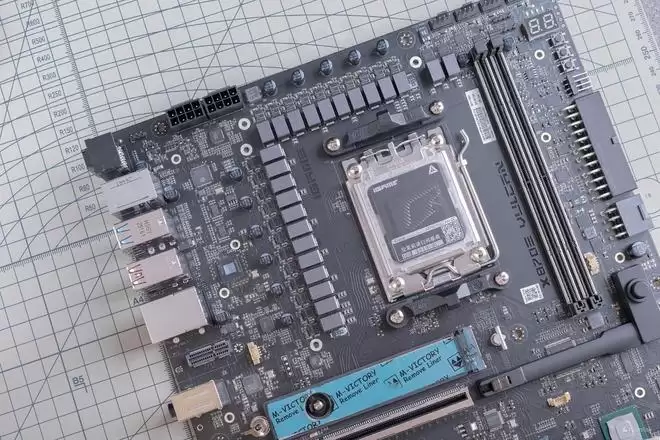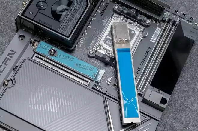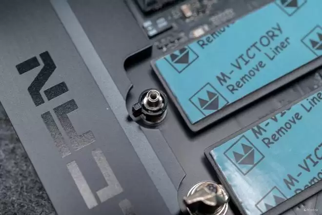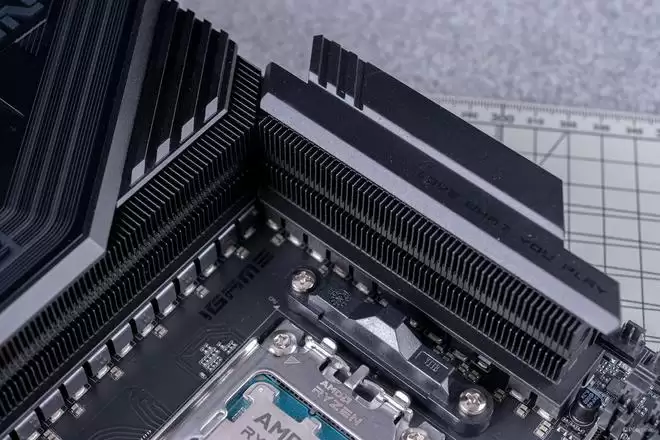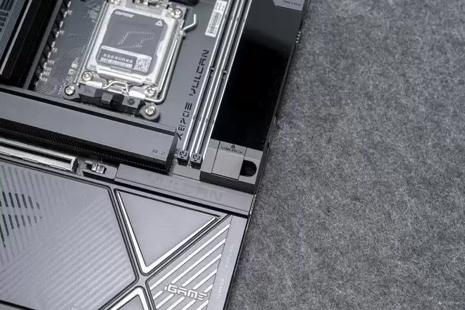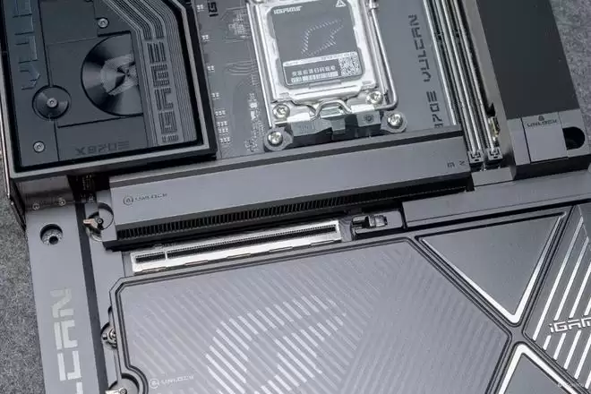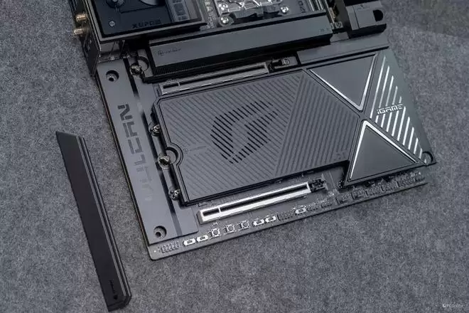 视角转到右下角的散热装甲,有一说一,这块散热装甲还是挺有份量的,揭开以后你就可以看到iGame X870E VULCAN OC V14 火神主板的两颗南桥芯片,与上代的X670E一致,并且相比X870芯片,X870E的扩展性会更强。